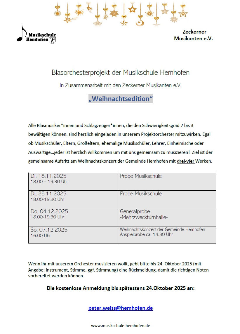 18.11 - 07.12.2025, Projektorchester "Weihnachtsedition" in Zusammenarbeit mit der Musikschule Hemhofen